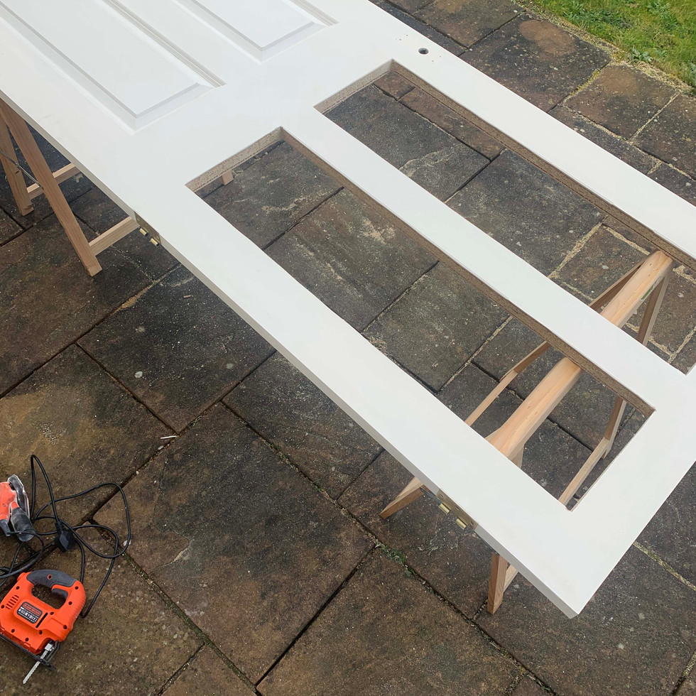 I cut two new openings using a jigsaw with an adapted blade, depending on the hardness/softness of the wood. Our doors were made of chipboard. If you're planning to do that too and it's your first time using a jigsaw, I always tend to say that it's better to cut on the inside of the line, rather than on the exact line, or worse on the outside of the line. It's always easier to sand afterwards, rather than having a hole that is too big. I didn't manage to cut a completely straight line, but on the next steps I used a filler to hide the imperfections!